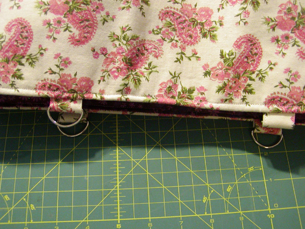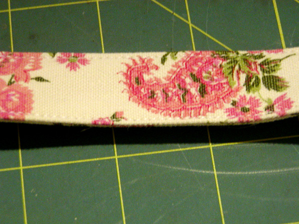 The handles are doubled, so I ironed them into a bias tape shape, threaded them through the rings, and sewed the ends together. I then did the edgestiching. It was a little trickier, but it prevented two of my sewing pet peeves. One, I didn’t want a bulky spot from sewing two four-layer, edgestitched ends together. Two, I hate turning tubes. I have a nifty bodkin, and I’ve read scores of tips in Threads, but I still end up with frayed pieces of fabric and even more frayed nerves. So, I cheat, and just fold the edges in on one side. If you stitch carefully, no one will ever notice. Here is one of my cheater pieces: