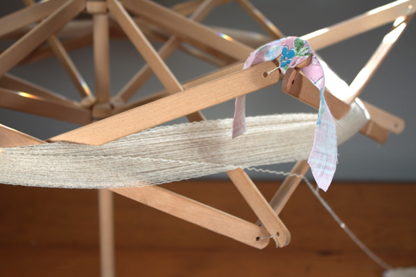 Here you can see the yarn part way unraveled. The pink tie is there so I can count the number of turns (and thus keep track of yardage).