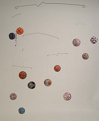 This was a mobile of tiny temari (at most 1 1/2″ in diameter) that I made for Lynne (my mom). I have always loved making mobiles and this art form seemed to just scream at me “Make me into a mobile!” The photo below is a smaller mobile I made for Loryn (my sister).