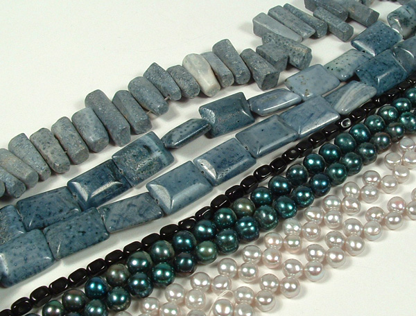 Blue coral is a light denim color with darker blue specks and whorls. I bought it in two shapes and cannot wait to use them. Also pictured are a strand of black glass rectangles with dimples on all the sides and two pearl strands. The blue/teal pearls are halfway between potato and spherical (I’m sure this shape actually has a name, although I don’t know it) and are absolutely beautiful. The natural, off-white pearls are dots. They are flat on one side and have a hole drilled towards the top to make them drop beads of a sort, supercute.