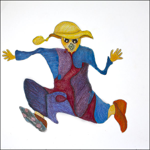 I had some trouble finishing the drawing of this squiggle. I wanted to show that she was yelling enthusiastically and needed some darkness in the interior of her mouth to show it was open. I was even given a lesson by Teri Partridge in how to draw the structure of the back of the throat, but that seemed to be too much detail for the drawing. I finally decided that I would fill her mouth with words. She is saying: “Hi! How are you doing? It’s good to see you.” I drew this when I was waiting to pick Loryn up at the airport so the wording seemed appropriate.
