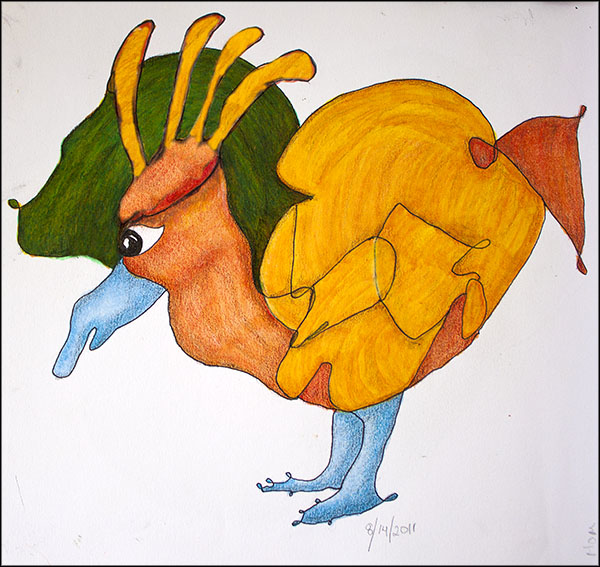 I used colored pencil, markers and photoshop on this one. I worked so hard on the green wing that the paper refused to take any more color. It is great that photoshop can fix these things. This started as a scribble by my mother.