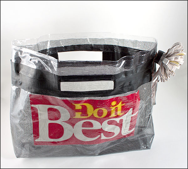 The electrician’s tape strengthened the open handles and made a nice decorative statement around the top of the purse. I fused the logo from the plastic bag to the front of the purse to add the graphic text and some much-needed color. Once you start fusing it is hard to stop. I fashioned the copper wire into my initial and fused it in a sandwich of clear plastic, fiberglass screen, the label from the paper bag and another layer of plastic for a hang tag.