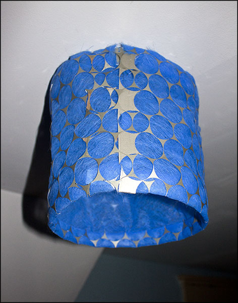 Loryn: I’ve been obsessed with lamps and lampshades for a long time, so I went into the $5 challenge thinking about a shade for my upstairs hallway, which just had a bare bulb. I looked at a lot of different materials, and the minute I saw the furnace filters, I knew I’d found the perfect item. I bought a blue fiberglass filter with sheet metal, punched with holes, on both sides. It took some time to pull the paper border off. Once I tried to roll the shade, I realized that the inside metal piece would have to come off. Luckily, not much glue holds filters together.