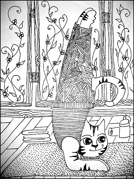I used markers to color this squiggle. The blue of her blouse and the orange stripes of her skirt are complementary and the green tights and red stripes of the skirt are complementary. It’s an interesting combination but I would not wear green tights even if I received many compliments.