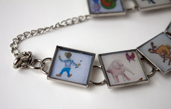 When I think about making something for someone, I try to consider what I would like to receive. I know my sister likes bracelets so I was pretty sure that I wanted to make her a bracelet. When I thought about it a little more, I realized that her squiggles would be awesome shrunk down and made into a bracelet for her.