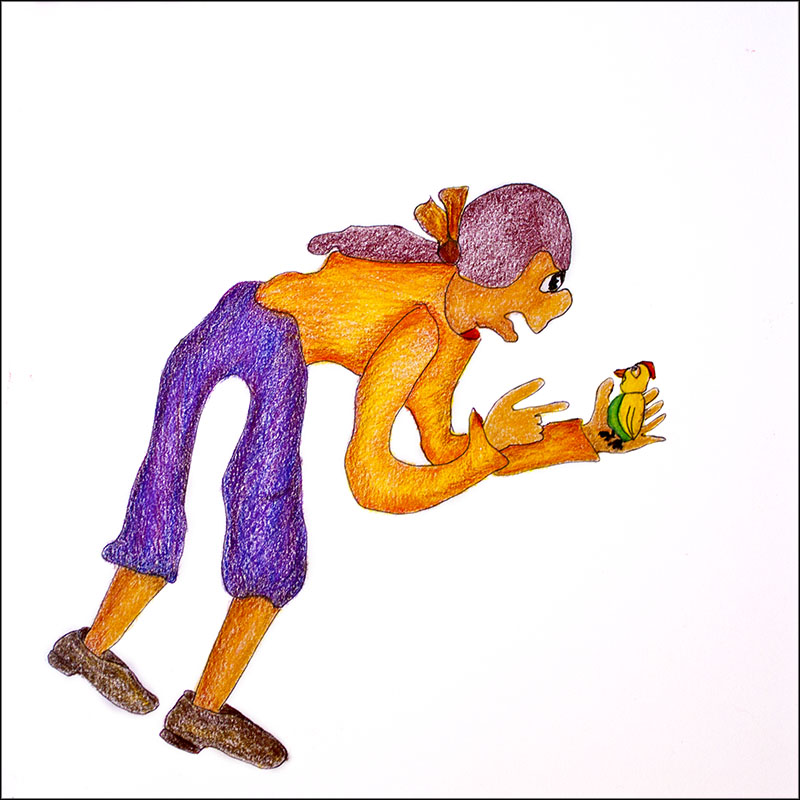 I wanted to work with violet and orange with a move from orange to yellow in the bird and the red and green of his breast and head. Two complementary pairs.