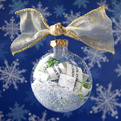 This was a very easy ornament to make for the Christmas Ornament Countdown. All I did was get a clear glass ornament, took the cap off, rolled the fortune with the wording on the outside and put it into the ornament. I added some glitter and some snips of ribbon, put the cap back on and tied a pretty piece of ribbon to the top of the cap.