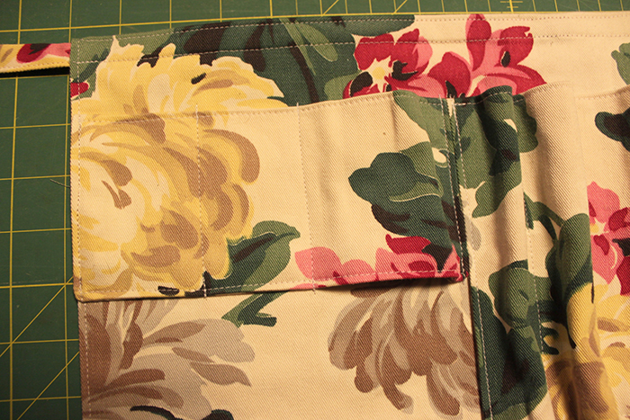 Here you can see the large pockets are stitched at the sides, but not the bottom. Sewing the bottom seam will be the last step. For now, we’ll move on to the smaller pockets at the sides.