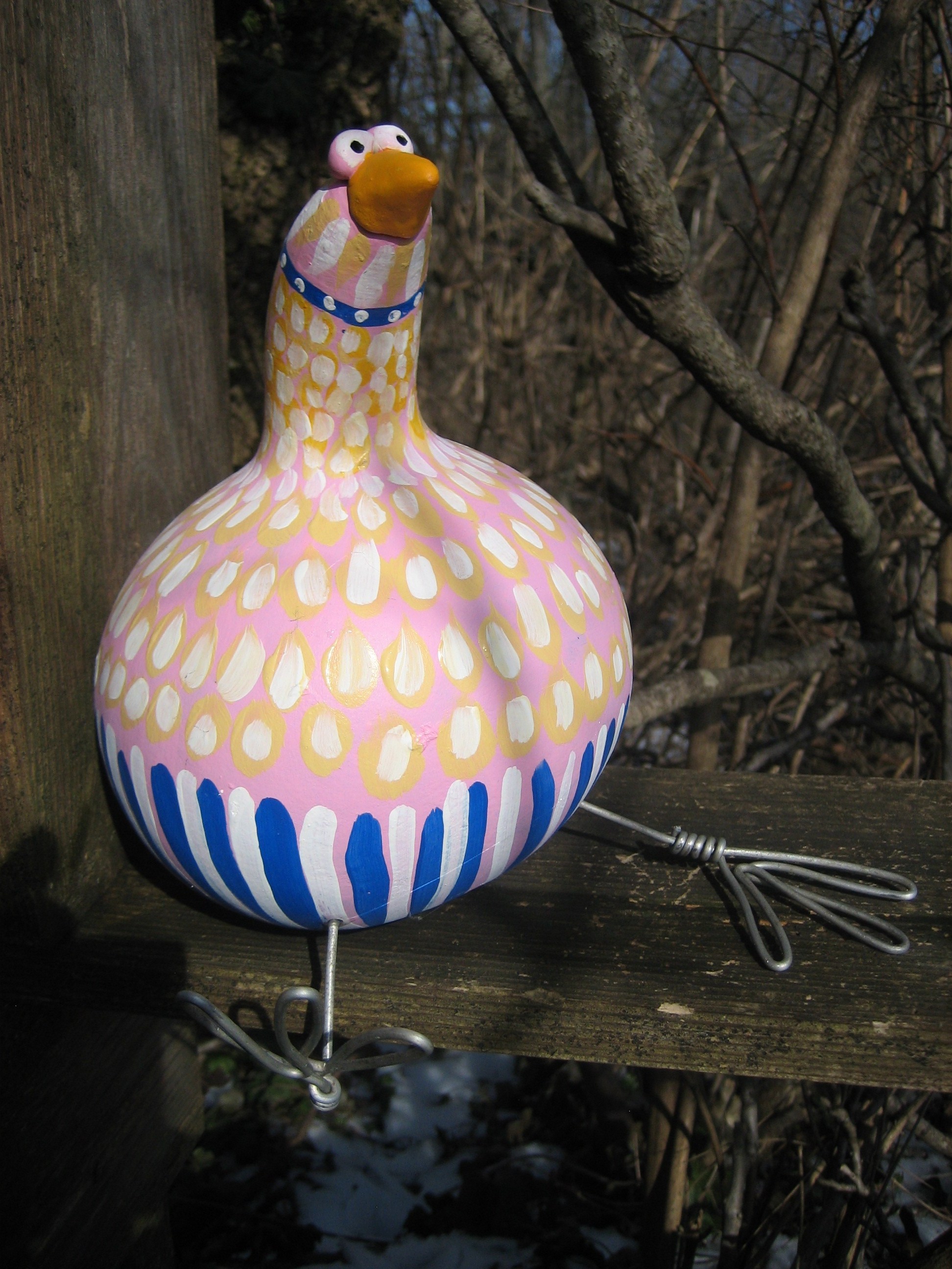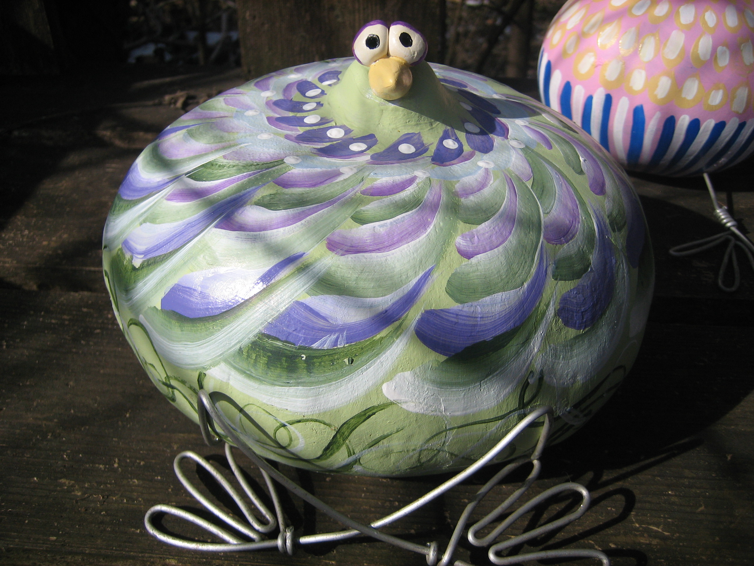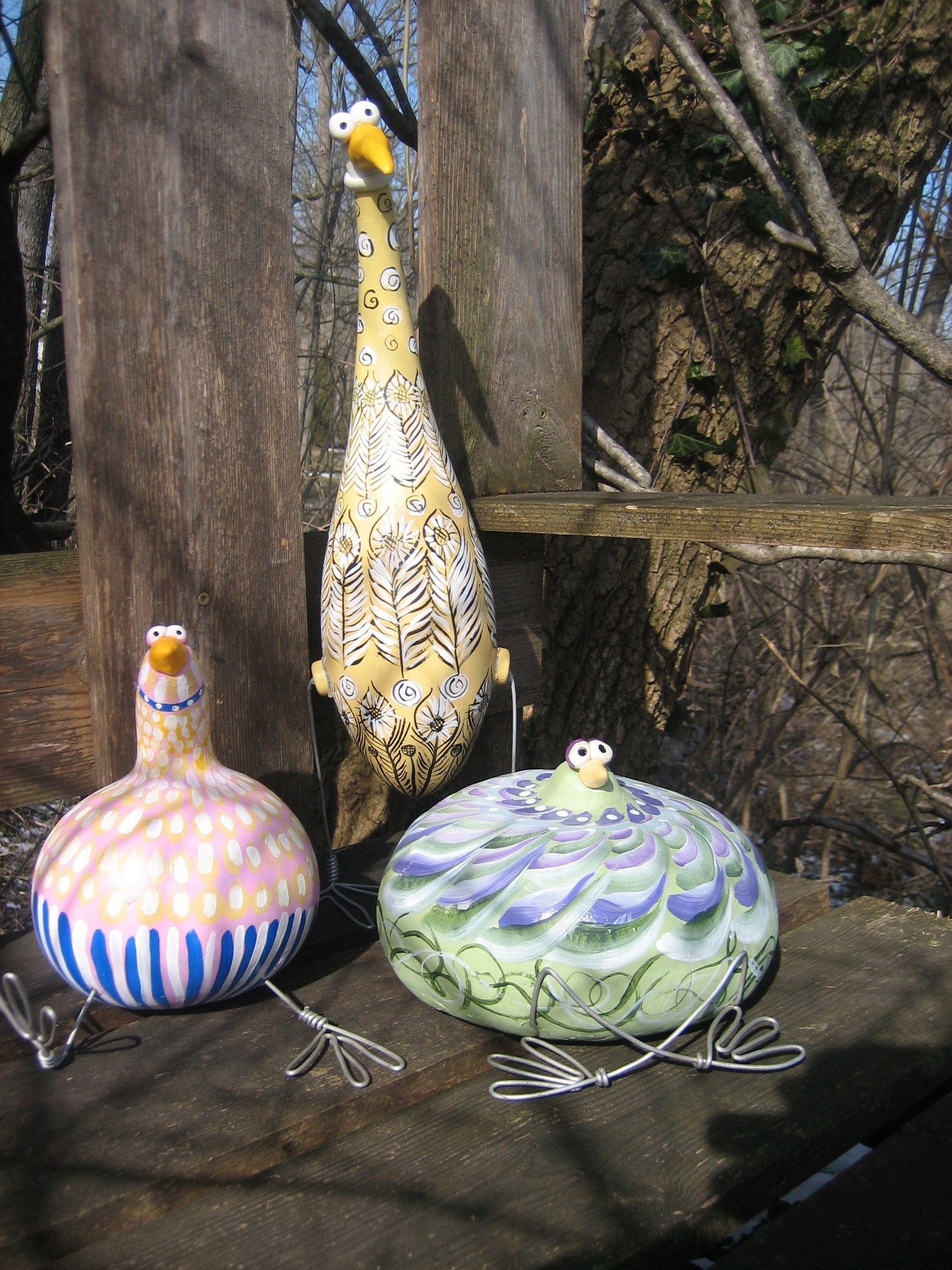 The eyes and beaks were a jumping off point. I painted them with bright colors and bent wire to make legs. I used a small knife to make a hole in the gourds and glued the legs in.
