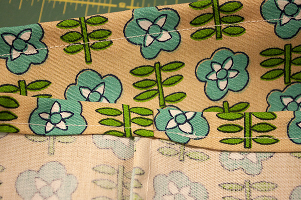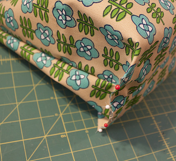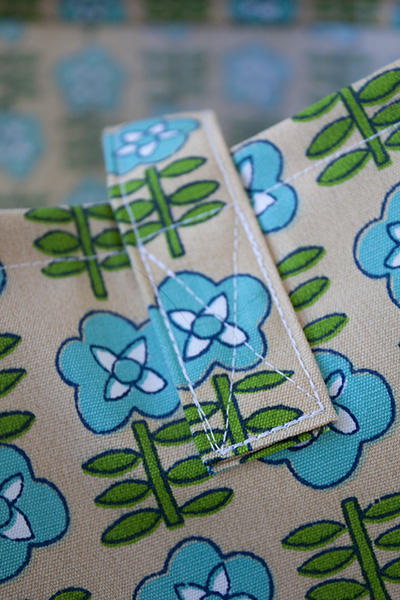 Turn the bag so that the wrong sides are out, and sew the final seam along the bag bottom corners. Now we’re ready to finish the top.