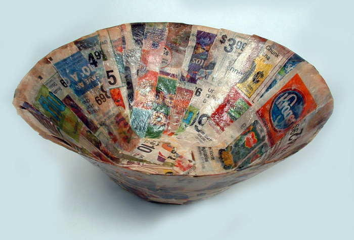 I wanted to make a bowl for the little stuff that seems to get thrown on the counter. As it would be in the kitchen, I figured what better paper to use than the Kroger coupons I get every week (I do most of my grocery shopping there). This proved to be a good idea as the paper Kroger uses for its ads tears beautifully into strips. I then draped the paper-mache strips over some wooden bowls I had. I like their shape but not the material. I had covered the bowls with Vaseline to keep the strips from sticking to the bowls. Notice I am using the plural here for bowls. I managed to turn out one good bowl from the two starts. I then let this dry.