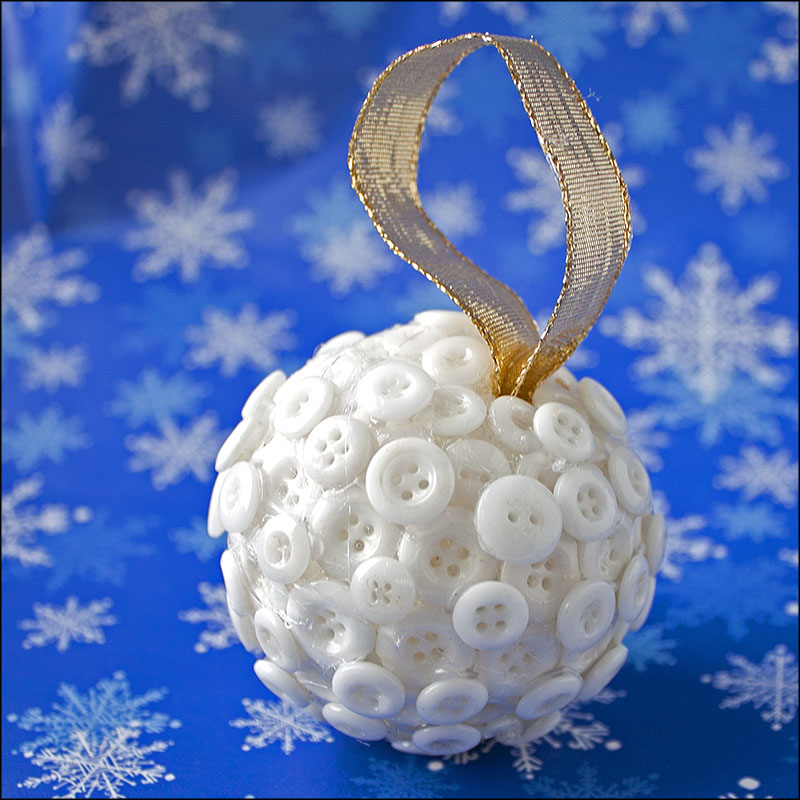To sew the buttons on, add one at the front and one at the back and stitch both on at the same time. When finished sewing through both button shanks or holes twice, make a quick knot underneath the button, and run the needle through the middle of the ornament to the next button location, without cutting the thread.