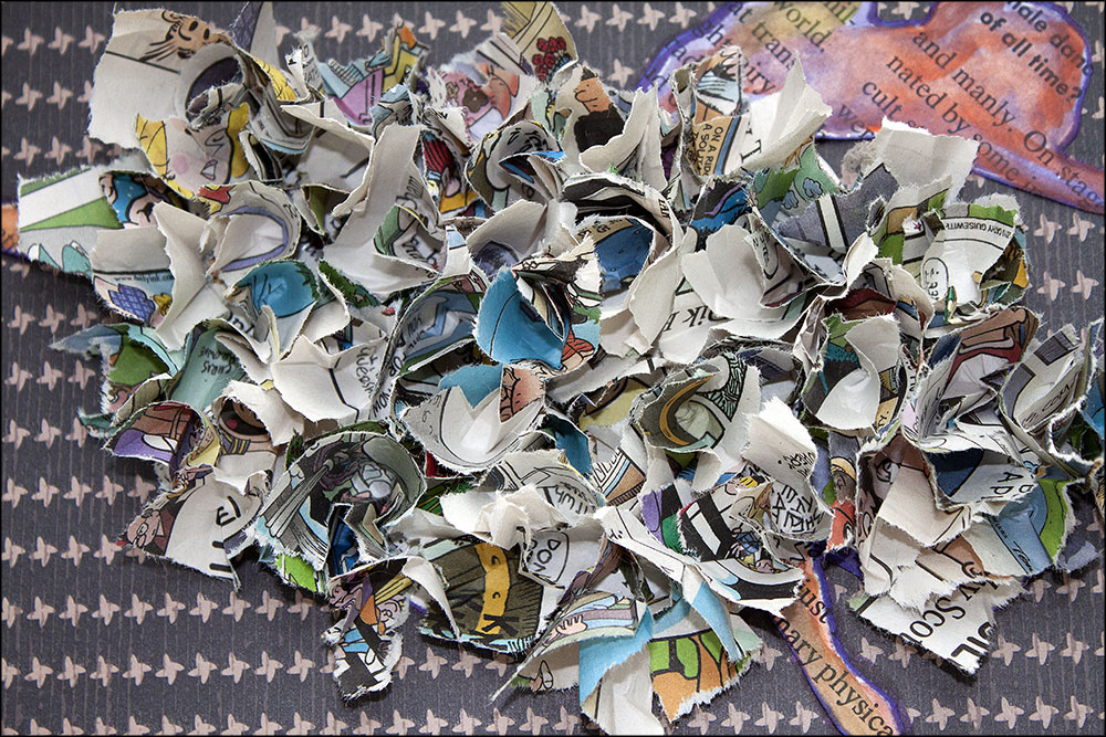 This is how I put together this tree collage. After I placed the branches, I decided the branches needed leaves.  I remembered the fortunes that I had been saving from our weekly trips to China Lane (a local Chinese food restaurant). They were perfect for the leaves after I gave them a little curl. The birds were made from Fimo clay and were left over from another project I had been working on. All of the pieces came together and it worked. I really like that when that happens.