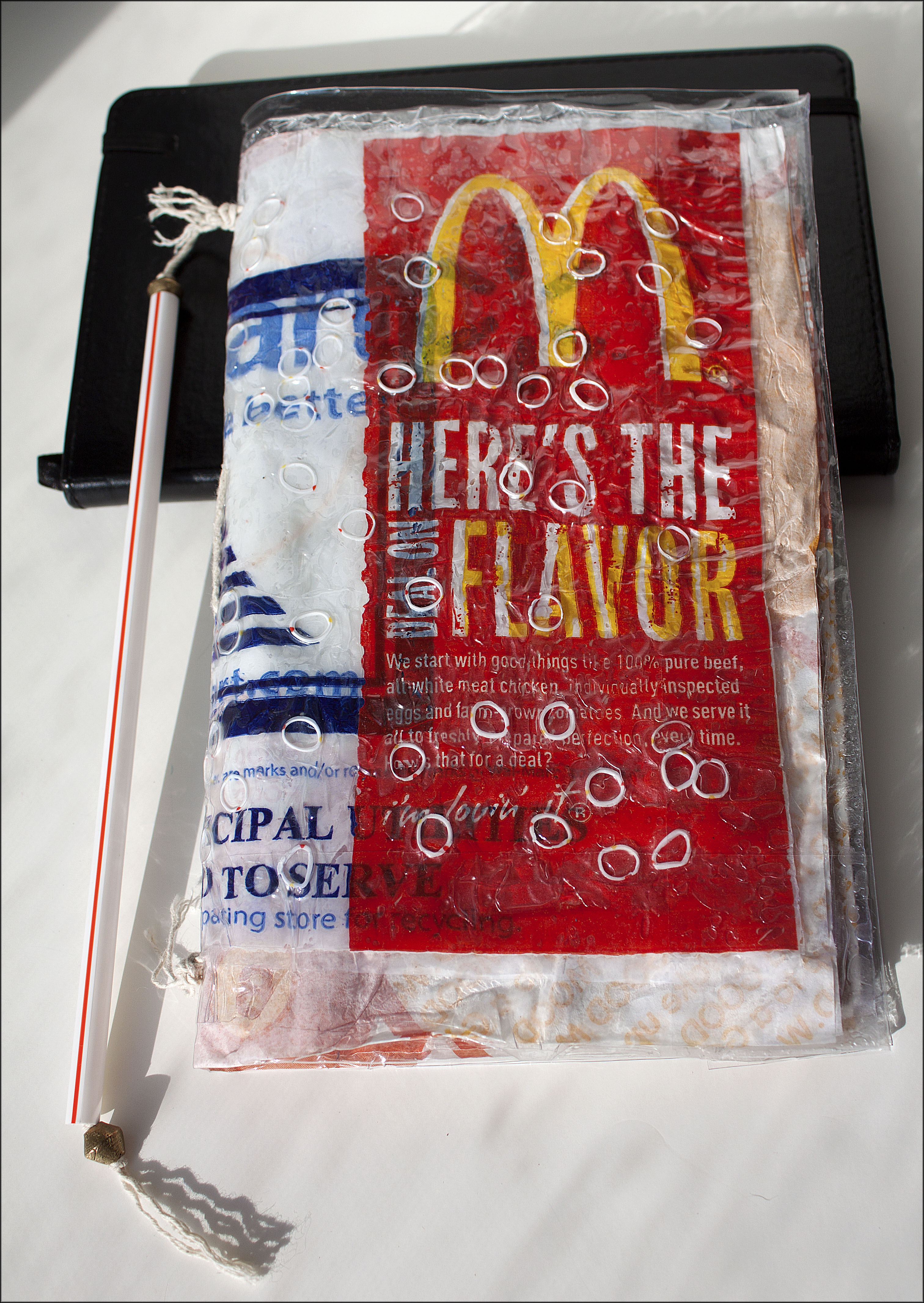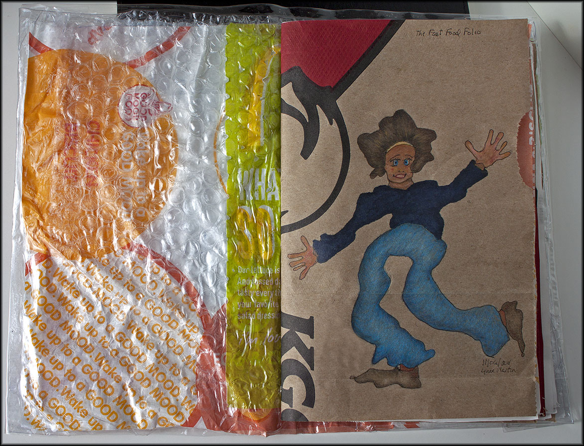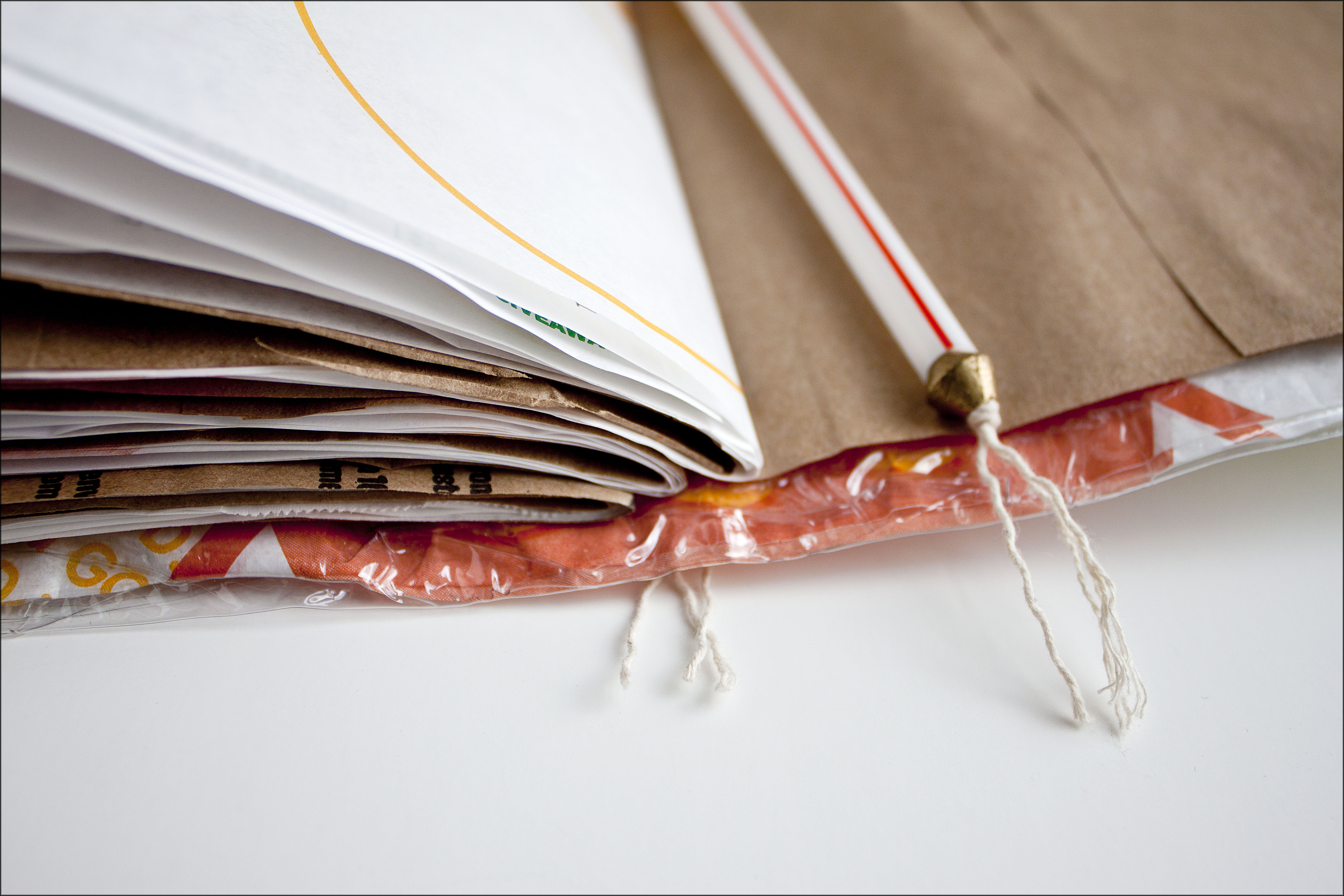 Outside cover and view of hand-sewn binding.Pages made of sales slips and sandwich wrappers.Detail of beads used to cap the drinking straw bookmark.Inside cover and first page with first squiggle on brown paper bag.
