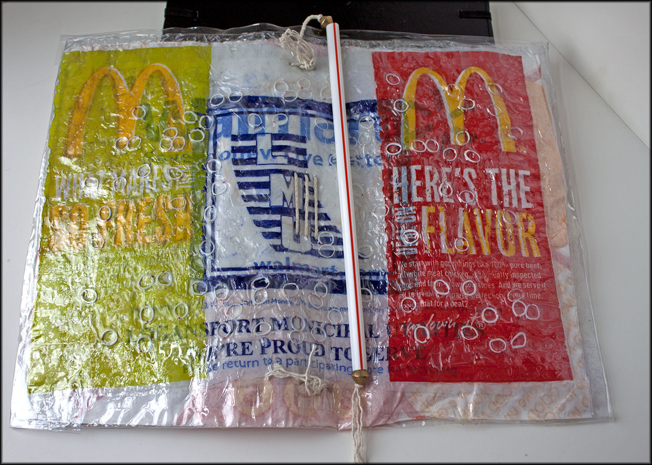 I decided that I would make the cover from layers of plastic bags, bubble wrap and sandwich wrappers. I wanted the bubble wrap to give the cover a honeycomb texture and to make the cover stronger. The plastic bags would provide the graphics and the sandwich wrappers were unique in that only one side is plasticized and I could use them as a protective layer on one side and a fusible layer on the other.