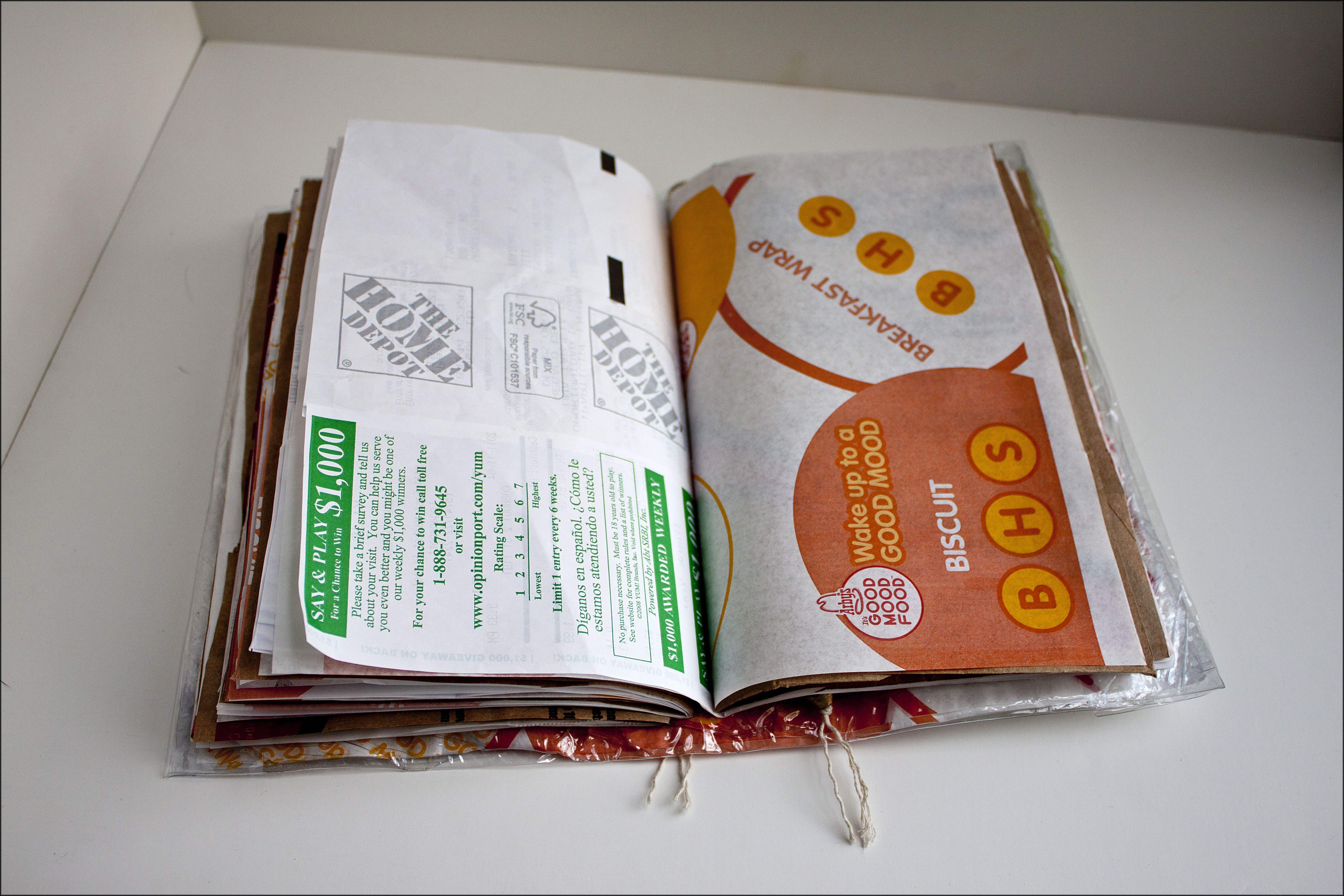 There were two materials that had particularly caught my fancy. One was sales slips. Every time I clean my car, I cannot believe how many slips I can accumulate in just a few days. The other was the paper wrappers that hamburgers and breakfast sandwiches come wrapped in. These materials are perfectly suited for their original purpose, but could I think of a secondary recycled purpose?