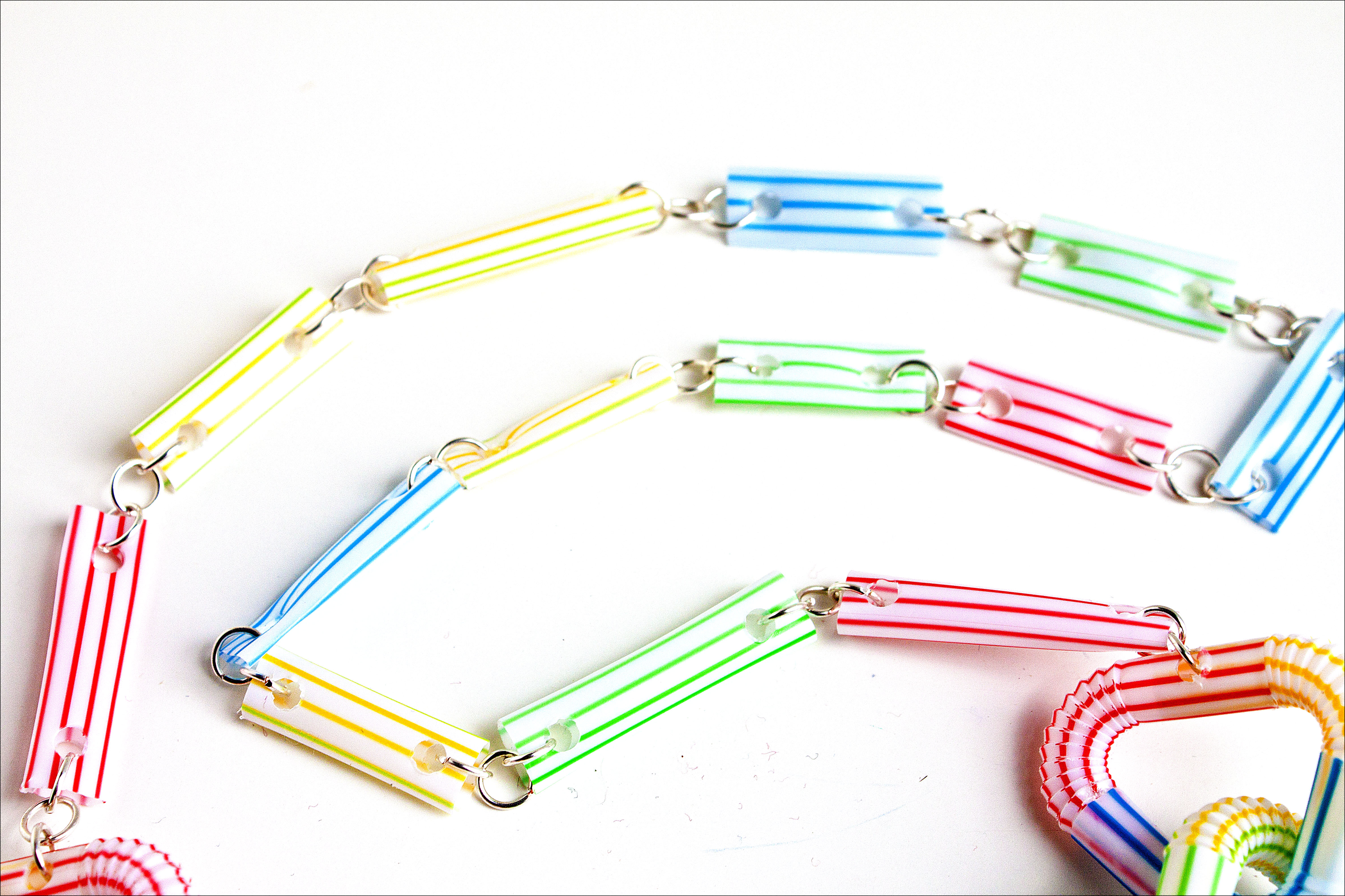 I worked with the possibility of making them into a bracelet, which would be awesome, but I really wanted to make a necklace as I had been working with using the leftover portion of the straws as a link in a chain and I liked how it looked.