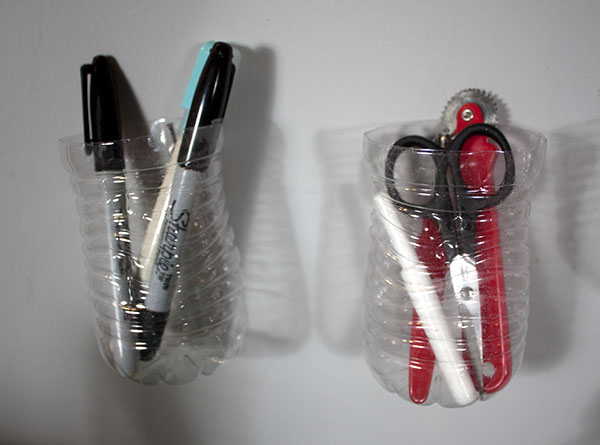 I cut the water bottles into various sizes and used grommets to hang them on nails. The grommets keep the plastic from ripping.. This scissors holder was a last-minute idea, but it may be the one that I like the most.