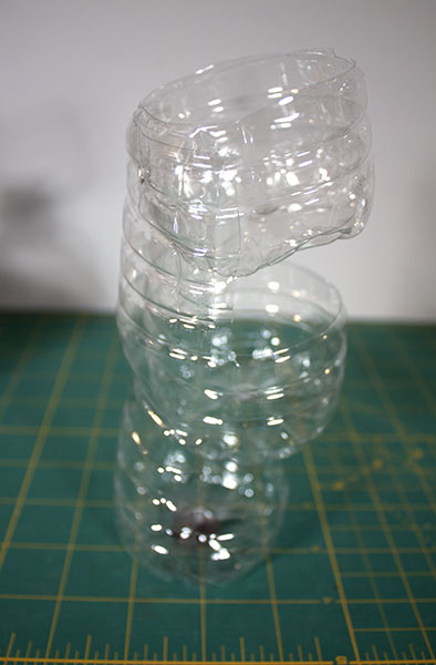 When I craft, I usually think in terms of functional, rather than decorative, objects. This craft challenge was no different. I started out with the idea of making an organizer with compartments, and I decided to use plastic bottles. I raided the recycling bin at work and got to work cutting up water bottles.