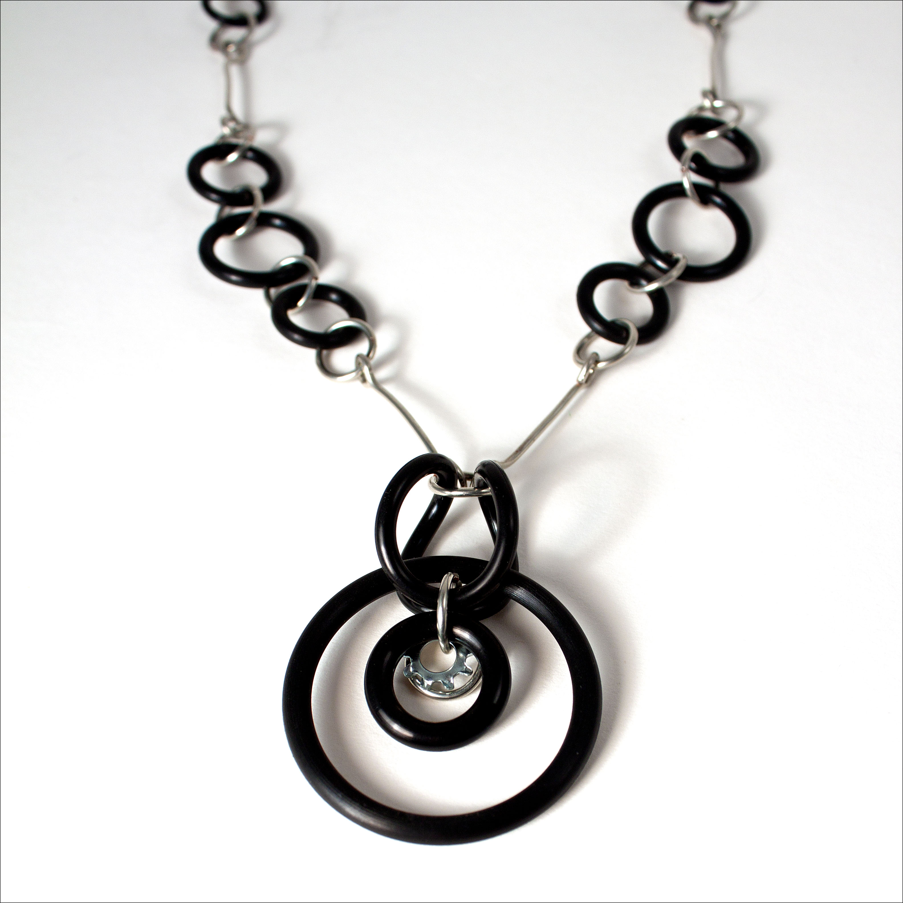 I divided the O rings up into sizes and worked with the large ones to see what I could make. I eventually hit upon the idea of twisting the circles to create a centerpiece for a necklace. I made wire links from wrapping the wire around a pencil and cutting them apart, and formed the longer pieces of wire by making a loop on each end. I was thrilled with the outcome and I think that the hardware store may become one of my favorite places to go for jewelry supplies.