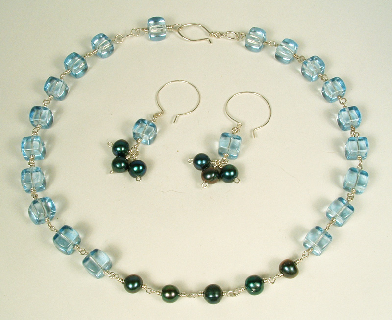 The necklace is made with sterling silver for the wraps and clasp, dark blue/teal pearl beads for the front part of the necklace and clear blue cube beads for the back part of the necklace.