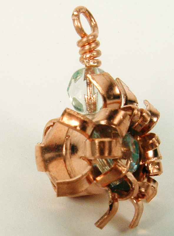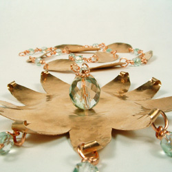 Using a compass I played Spirograph on a copper disc and cut out the star burst pendant. Amazingly, the copper is thin and soft enough that you can cut the discs with heavy duty scissors. I hammered the star on both sides to give it some depth. I then curled the points of the star (I couldn’t see any other way to really blunt the points. Those suckers were sharp!) to keep from puncturing anyone wearing it or snagging your clothes. I attached the light green crystal bead in the middle with wire and did some wire-wrapped crystals (also light green in color) for the dangles at the bottom of the pendant.