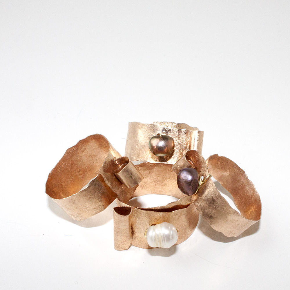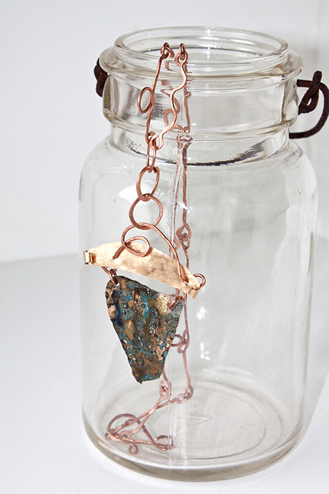 Cheri: It felt so good to get back to a challenge after our winter hiatus. And this challenge couldn’t have been better. I think we were all a little excited and a bit apprehensive when this project was initiated. After playing with the copper for awhile, knew whatever I made, it would most likely be jewelry. This is when I let the metal do the talking. I had a ball peen hammer and a small vice with a flat edge and I went to town banging on some copper. I was pleasantly surprised with how pretty the copper became after being hammered. Metal can lose what small elasticity it has in it after it has been work-hardened so I really wanted to make sure that I did not overdo the hammering or it would become brittle. After I had mastered the shape I wanted, I decided to do some research on adding a patina. I came across an article that said I could add blue to the copper by suspending the piece over a bowl of ammonia in a closed container. This was super easy, just be careful with the odor, it can be a bit overwhelming. The patina on my piece took about 12 hours to achieve and I think it came out pretty nice.