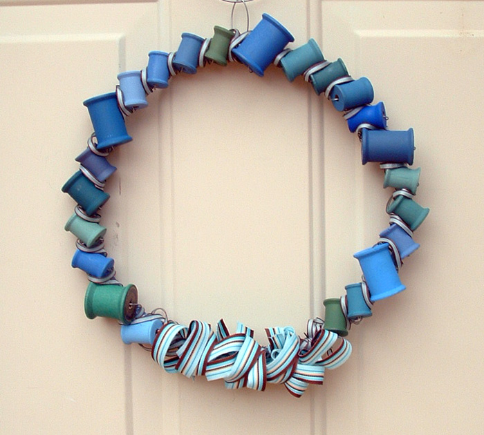 Next, I cut the Styrofoam ball in half and tested the appearance with the be-ribboned skewers stuck in the half ball.