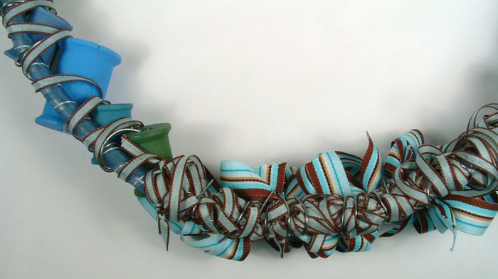 I stuck the bamboo skewer in the Styrofoam ball for stability and handling and started tying on ribbons with simple overhand knots. The ribbons are tied on with the longest, 5″, tied at the bottom, then the 4″, and finally the 3″ pieces at the top. I mixed up the colors as I went along.
