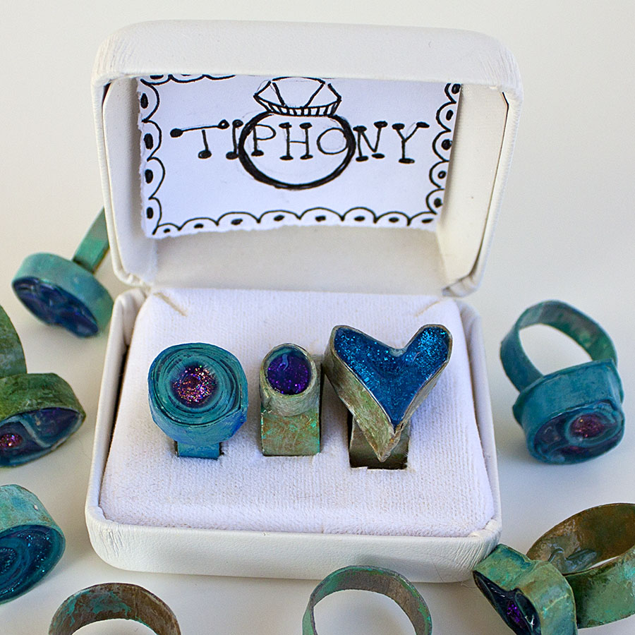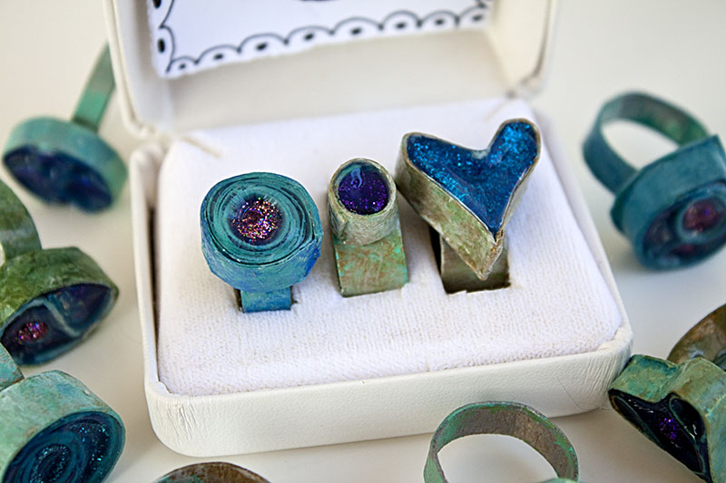 These rings are similar to how they would be made if I was using a precious metal, only a whole lot easier. The bezels are created by gluing a strip of cardboard into a ring. Then glue the edges of that ring to another piece of cardboard. After it is dry I cut closely around the strip.